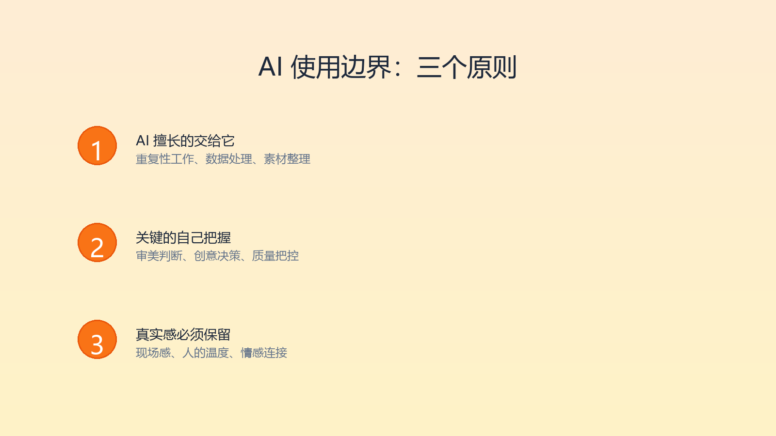 把重复性、机械性的工作交给 AI 提速,把需要审美、判断、真实感的部分留给人。