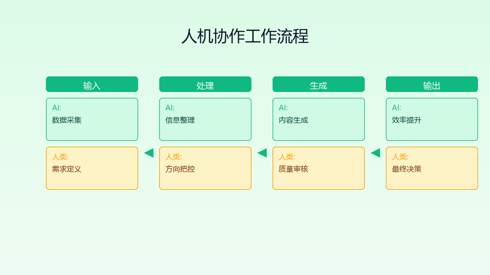 真正高效的工作流是人机协作:AI 在它擅长的环节提速,人在关键节点把控质量。