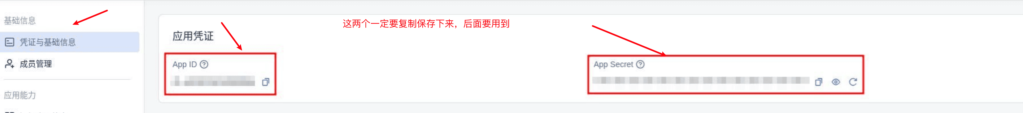 - 创建完成后,进入这个应用,在凭证与基础信息页面你会看到两个重要信息:App ID 和 App Secret