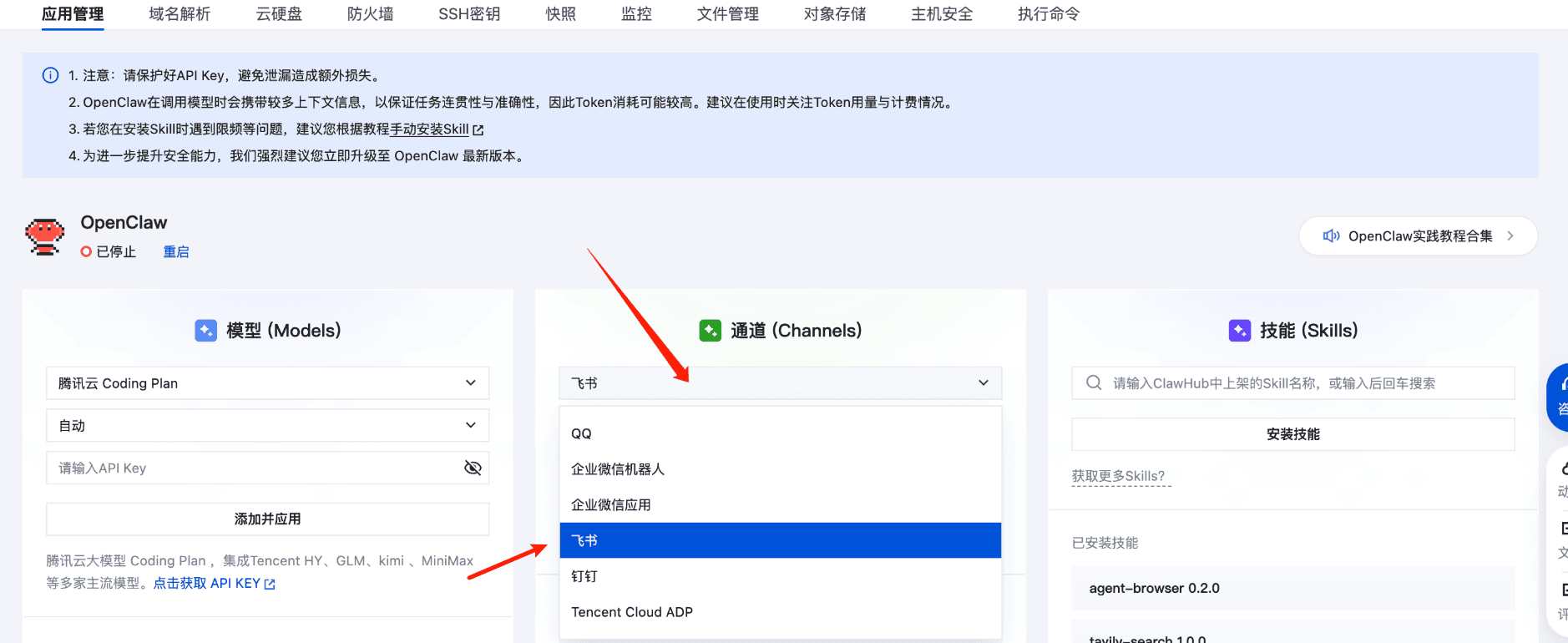 OpenClaw 侧配置:安装飞书插件并绑定通道