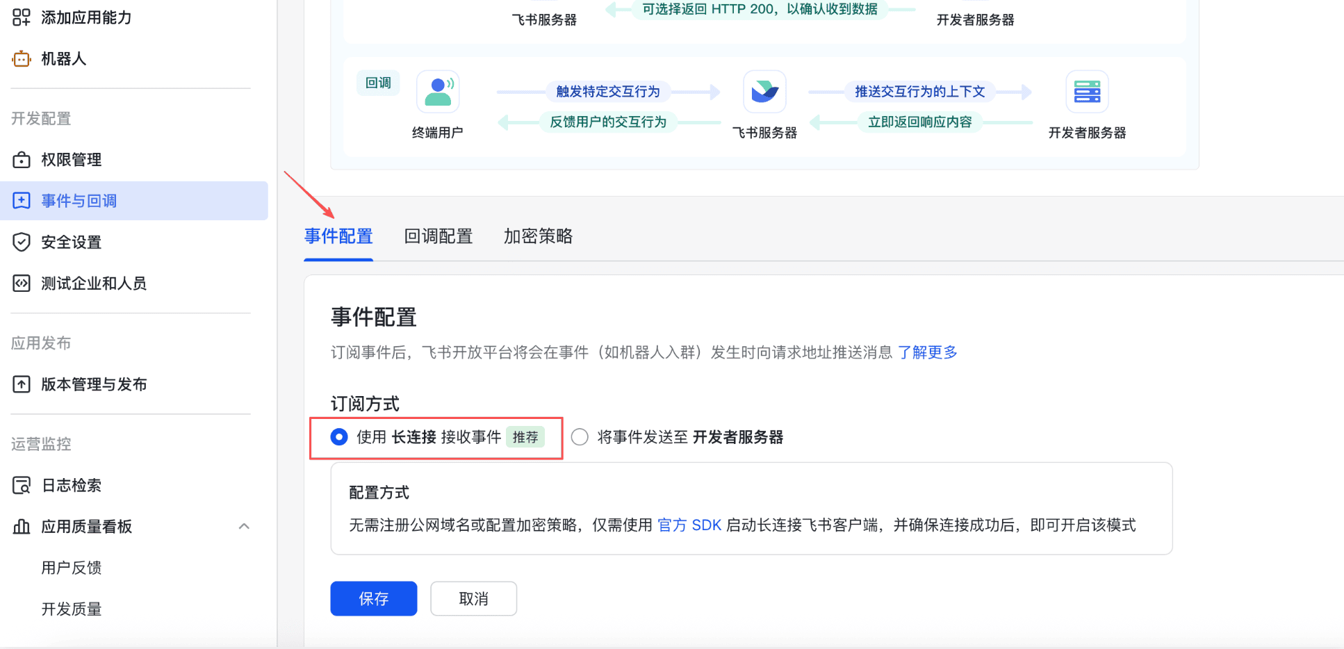 - 订阅方式选择 使用长连接接收事件——这一步非常关键,一定要选对