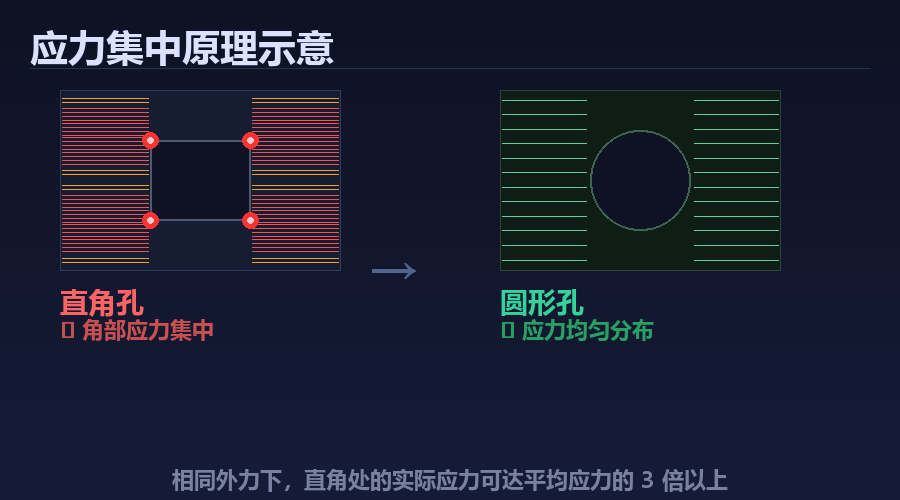 在工程力学里,有一个概念叫应力集中(Stress Concentration):当一个受力结构上出现缺口、孔洞或角时,那个位置的实际应力会远远大于平均应力,像漩涡一样把周围所有的力都"吸"过来。
