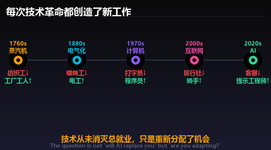 蒸汽机时代、电气时代、信息时代——每一次,都有人在恐惧中旁观,也有人主动跨进去,成为新时代的受益者。