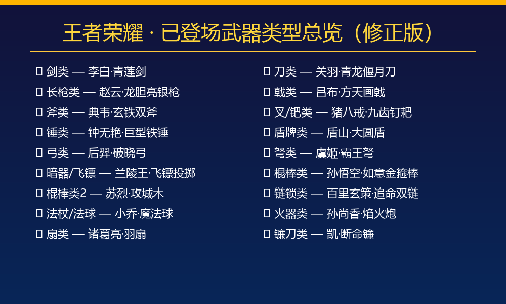 传统十八般兵器(刀枪剑戟斧钺钩叉鞭锏锤戈镋棍槊棒矛钯)中,钺、鞭、锏、戈、镋目前在王者里没有以其为主武器的英雄,是最主要的空白门类。