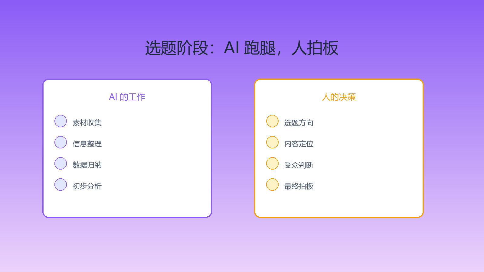 但选题的方向、最终拍什么内容,这些决策还是团队自己来拍板。AI 只是帮忙干了前期跑腿的活。