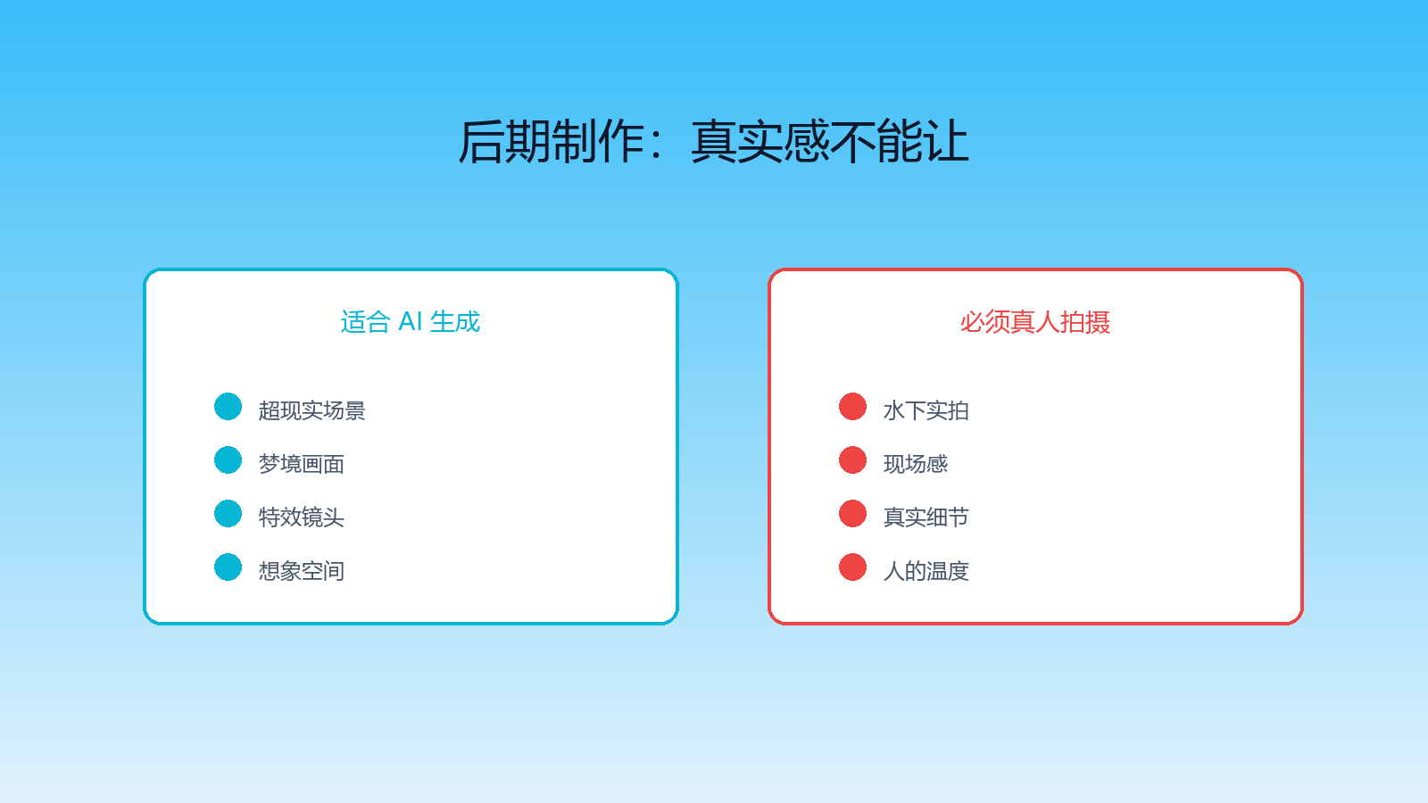 这个边界划得很明确:超现实、想象性的内容可以用 AI;需要真实感、现场感的内容,必须人去拍。