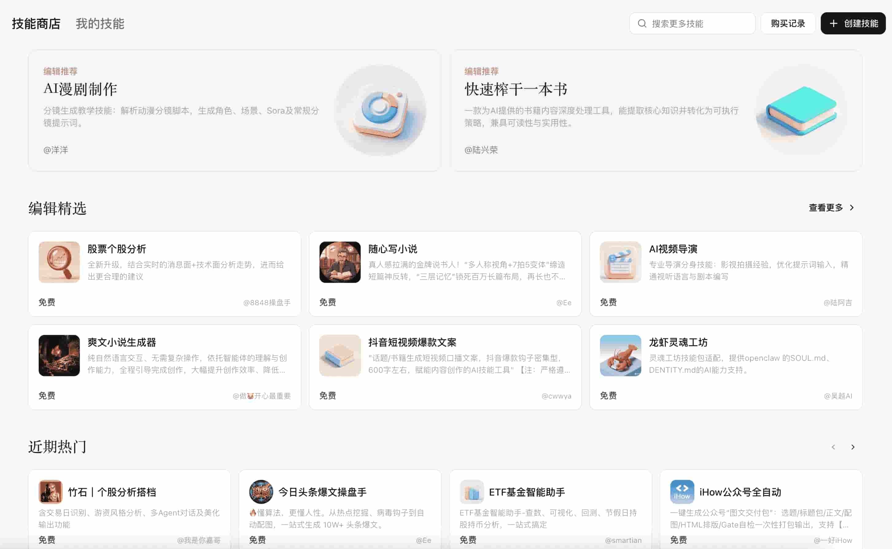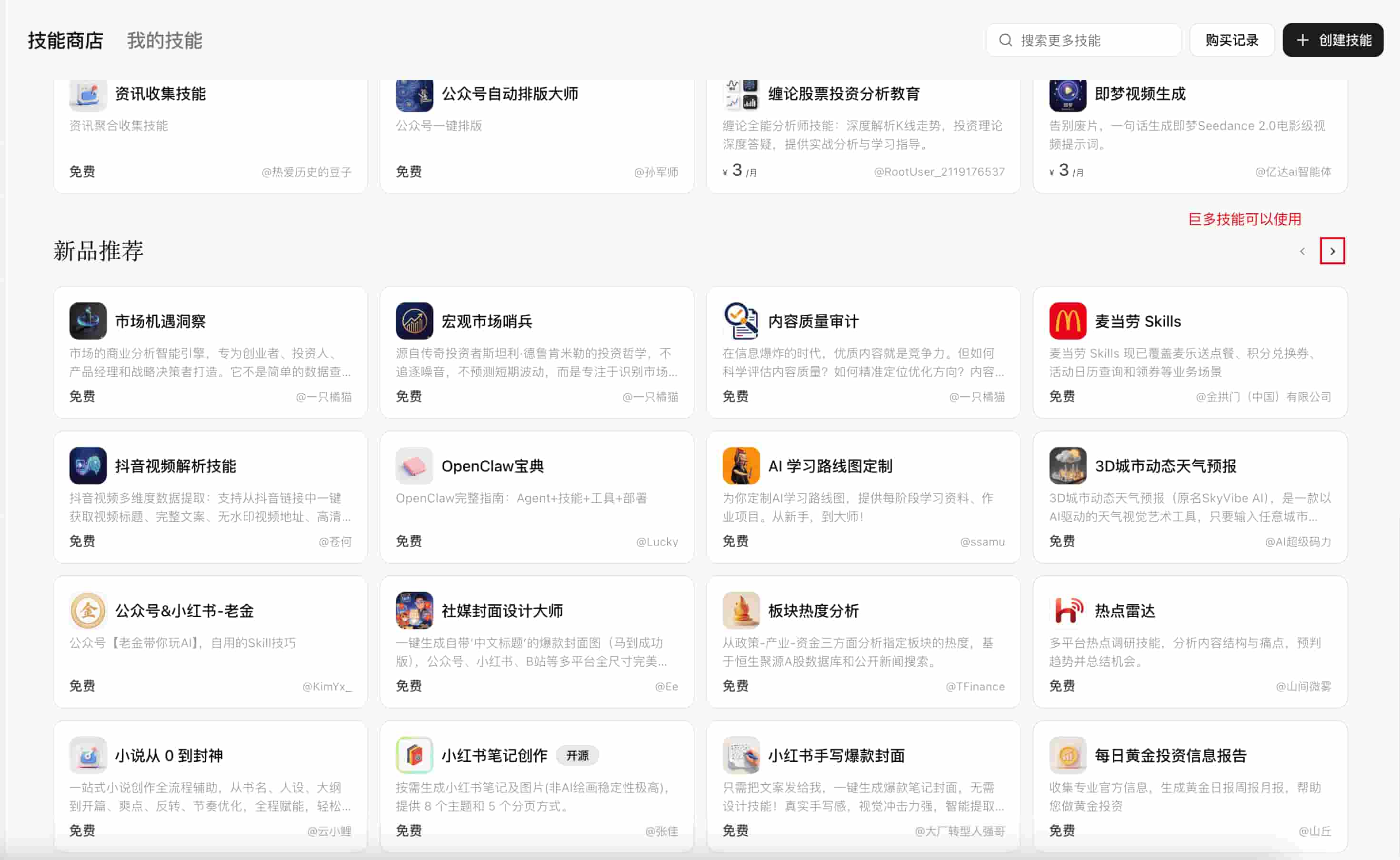 登录后点击左侧的"技能商店",你会看到分类清晰的技能列表。建议新手从以下几个实用技能开始: