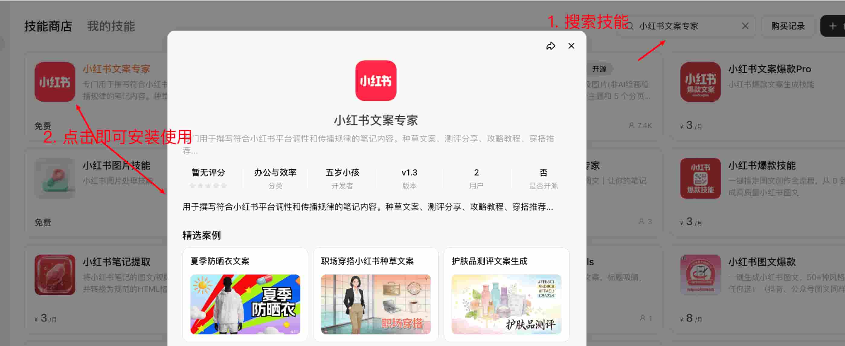- 搜索《小红书文案专家》并且点击技能卡片查看详细描述