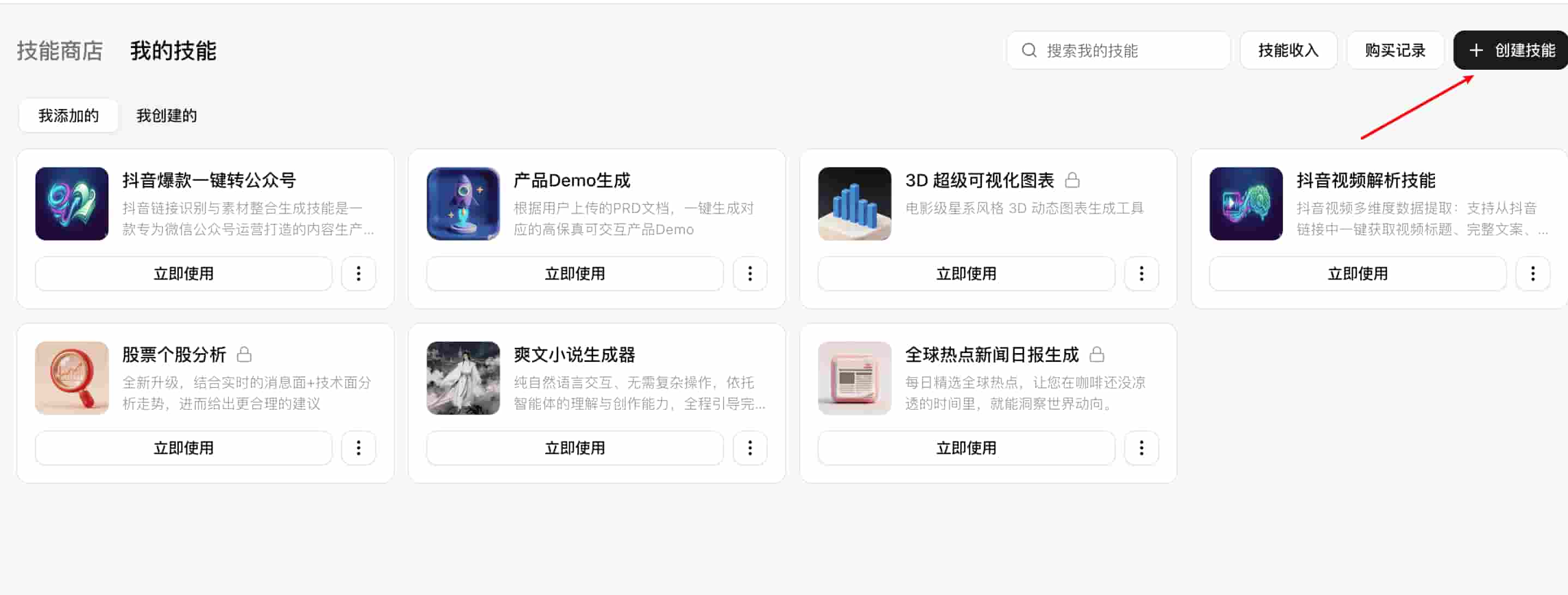 点击右上角"创建技能
