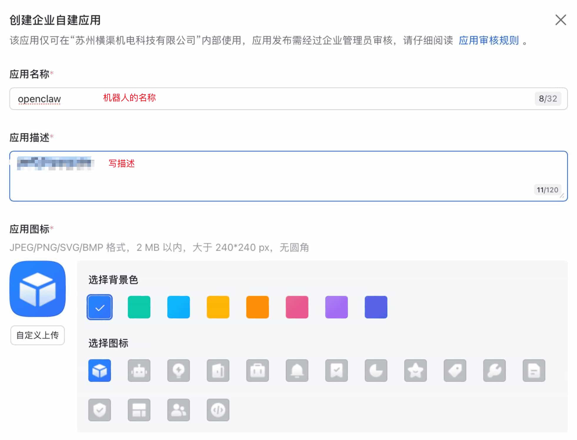 - 填写应用名称(随便起个名字就行,比如"我的 AI 助手")和应用描述