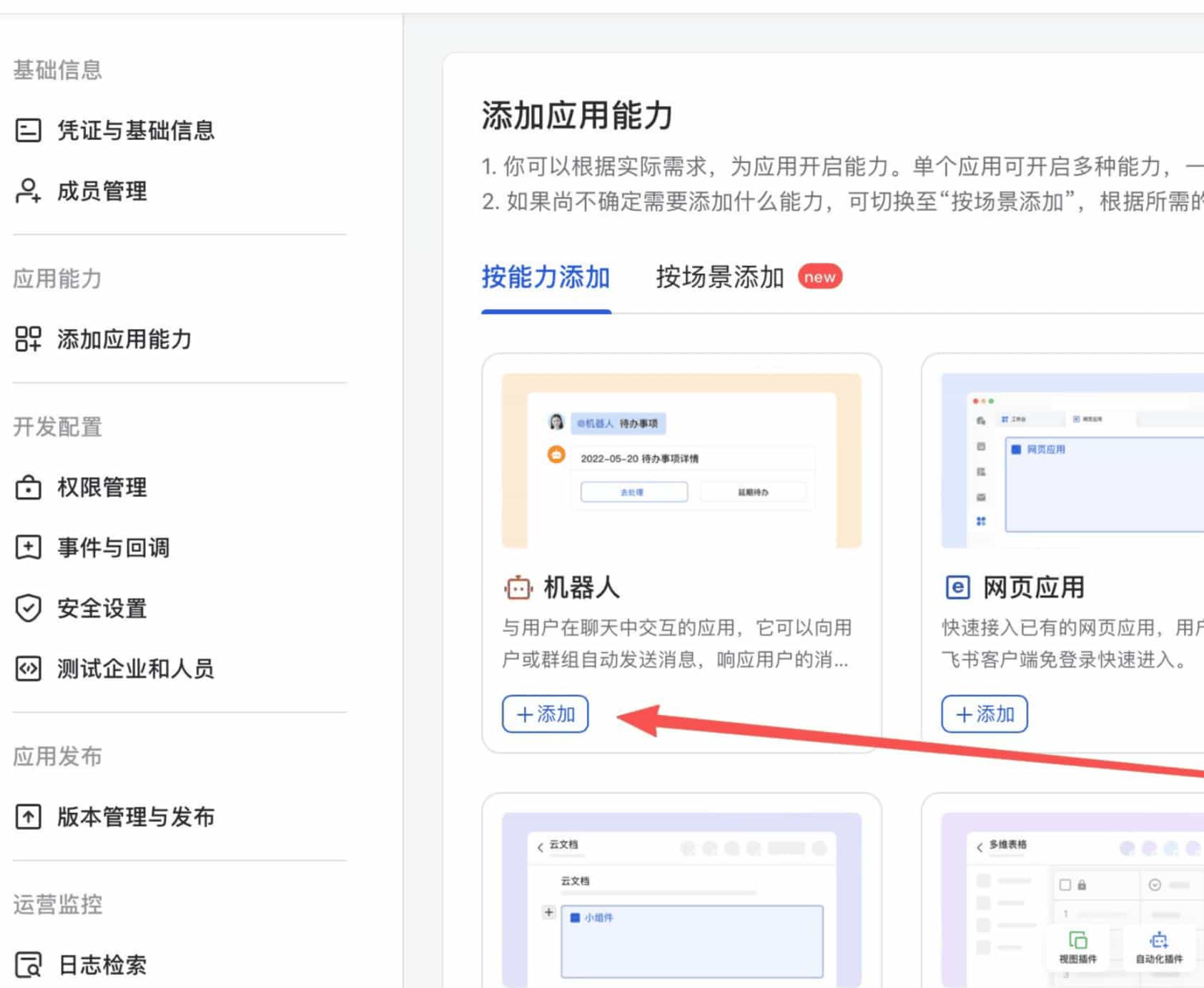 还是在这个应用的页面里,在左侧菜单找到 应用能力 > 添加应用能力,选择机器人并点击添加。这一步是告诉飞书:“这个应用是一个机器人,它需要能在聊天中收发消息。”