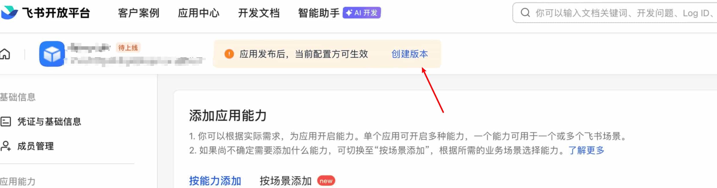 然后需要重新发布一次应用版本(跟前面发布应用的步骤一样:版本管理 > 创建版本 > 发布 > 审批),让新的配置生效。