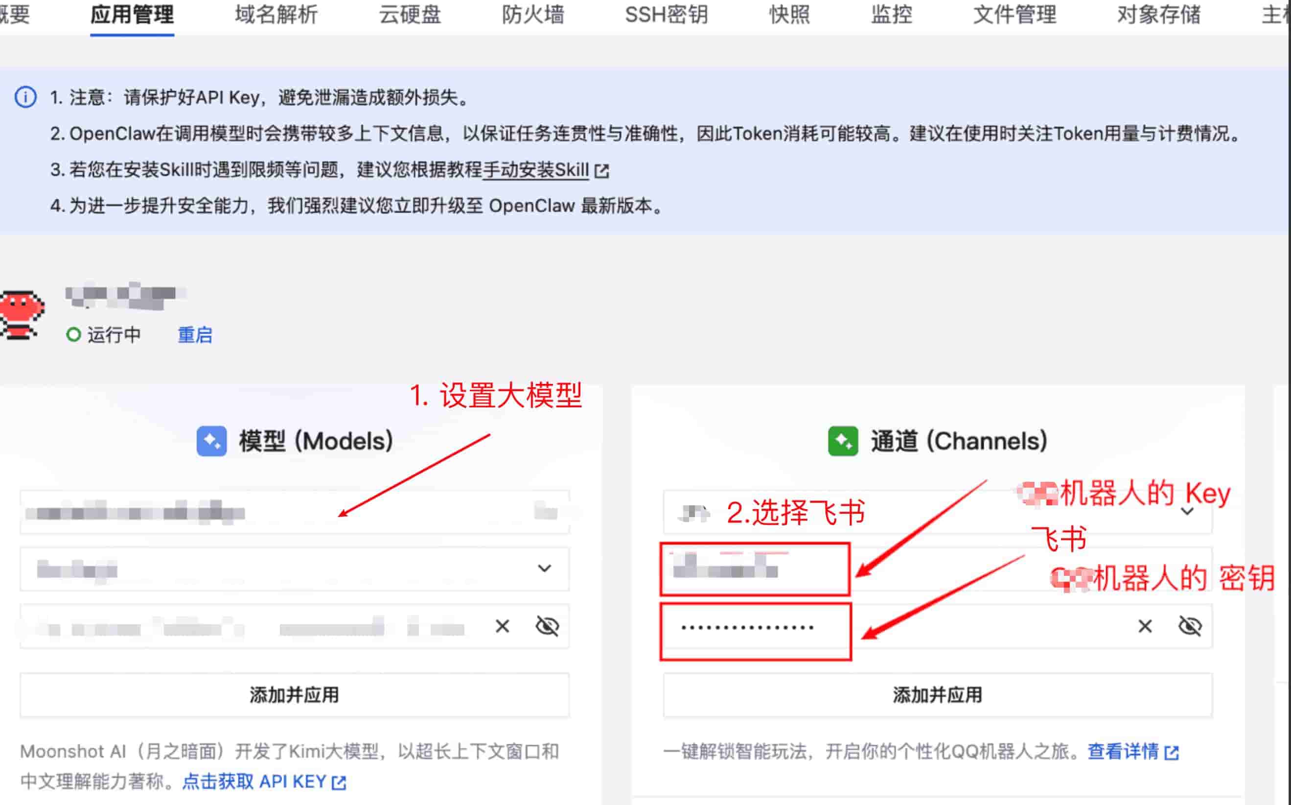 - 在飞书上创建机器人:去飞书开放平台创建一个应用,给它加上机器人功能和必要的权限,然后发布