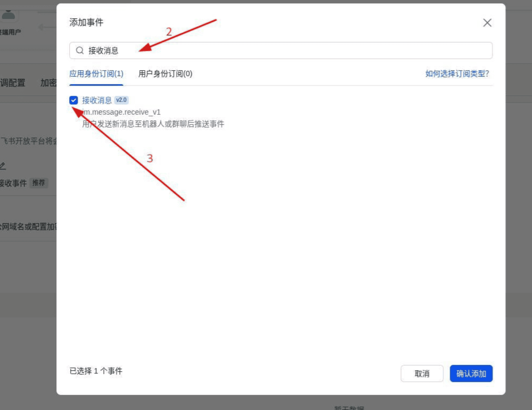 im.message.receive_v1,找到后点击添加。这个事件的意思是"当有人发消息给机器人时,通知 OpenClaw" - 保存配置