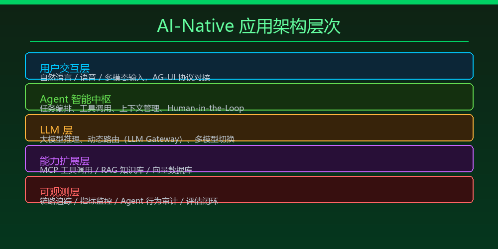 一个相对完整的 AI-Native 应用通常由以下几层构成: