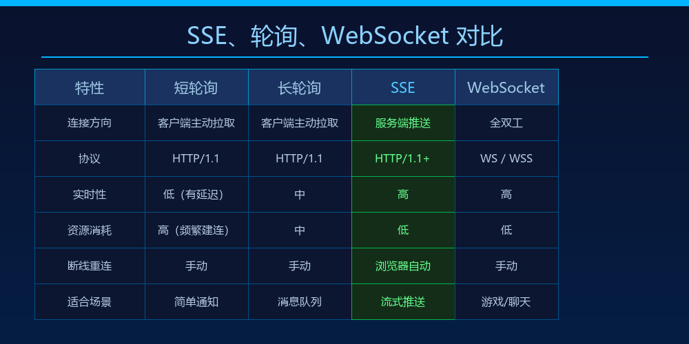对于纯推送场景(新闻、通知、AI 流式输出)这完全够用;对于需要双向实时交互的场景(多人协作、游戏),WebSocket 更合适。
