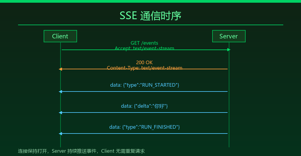 AG-UI 协议的事件流传输,默认也推荐 SSE。关于 AG-UI 的介绍请移步文章: