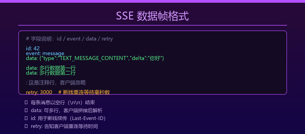 \n\n)结束,服务端写完一条消息后必须刷两个换行 data:可以写多行,客户端会把多行拼成一个字符串再处理- 发送 JSON 时直接把序列化后的字符串放在